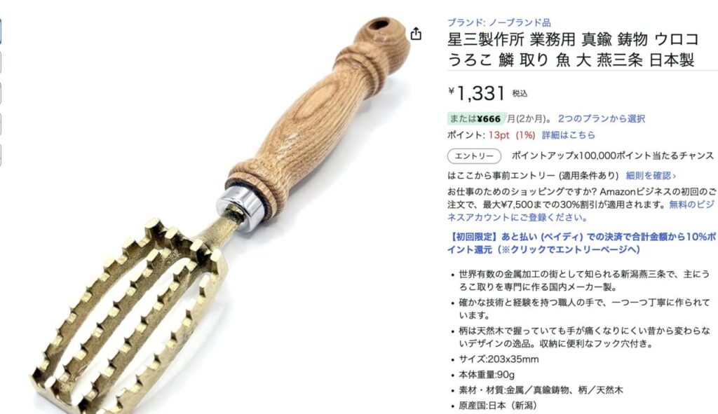 - サゴシは比較的うろこが細かいので、専用のスケーラーがあると処理がスムーズ。キッチンを汚さずに済む。